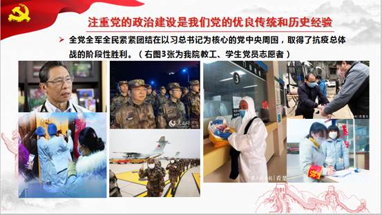 党委书记郭昕以《政治建设:党的根本性建设》为题为全院师生党员讲授党课,主要围绕:讲政治,马克思主义政党的根本要求;以政治建设为统领,扎实推进全面从严治党;党的政治建设是一个永恒课题三个方面进行了阐述。重点讲述了全党全军全民紧紧团结在以习近平同志为核心的党中央周围,自觉做到“两个维护”,坚定服从党中央和习近平总书记的统一号令,党中央和习近平总书记领导全党全军全国各族人民打好打赢疫情防控的人民战争、总体战、阻击战。还分享了好色视频