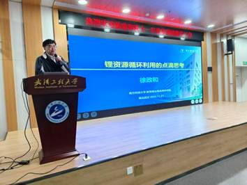 随后,徐政和院士在综合楼102报告厅作了题为《锂资源循环利用点滴思考》的学术报告。报告从全球锂资源的分布格局与需求趋势切入,系统梳理了矿石提锂、盐湖提锂及退役电池回收锂等领域的最新研究进展。报告内容既包含了高容量、高选择性、高回用性的吸附材料的制备和高通量、低成本、环保的吸附体系构建等研究工作,还包含了退役电池可控爆破提锂机理、方法与实践进展等。从科学机理、方法开发、成果应用等多方面总结了近期锂资源循环利用技术的关键突破。