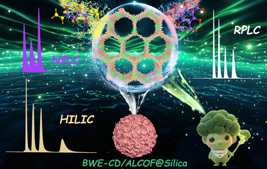 西兰花水提取物衍生碳点(BWE-CDs)具有天然来源、成本低廉、稳定性高及亲水性好等优点。由芳香族基团构建的共价有机框架(COFs)表现出显著的疏水性,限制了其在亲水分离领域的应用。近年来,脂肪族连接基COFs(ALCOFs)被认为能有效调控亲疏水平衡。因此,汤胜副教授团队提出了一种将BWE-CDs与ALCOFs复合以构建新型色谱固定相的策略。以水为反应介质合成的BWE-CDs与具有可调控亲水/疏水性的ALCOFs,通过一锅法修饰在氨基化硅胶上,从而制得了性能优异的BWE-CD/ALCOF@Silica复合材料。