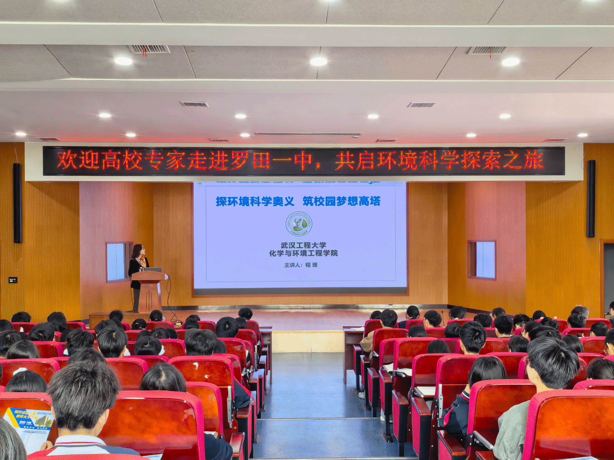 在科普讲座中,程璟以《探环境科学奥义,筑校园梦想高塔》为题,为罗田一中学生带来一场精彩的科普讲座。她结合环境科学领域前沿知识、科研成果与生活实际,用通俗易懂的语言讲解环境科学核心内容,展现学科魅力与发展前景,同时结合高中学习特点,为学子们分享学习方法、备考心得,鼓励大家坚定理想、勤学笃行,树立远大求学目标,在追求科学真理的道路上勇毅前行,用知识筑牢梦想根基。