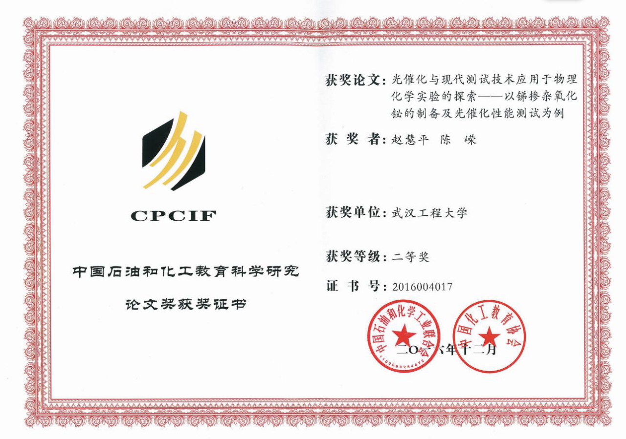 近日,好色视频 赵慧平、陈嵘教授在在化学类教育顶级期刊(中文核心期刊)《化学教育》上发表的教研论文“光催化与现代测试技术应用于物理化学实验的探索------以锑掺杂氧化铋的制备及光催化性能测试为例”喜获中国石油和化工教育科学研究论文二等奖。此外,两位老师在《化学教育》上撰写的另外一篇教研论文“浅谈物理化学教学过程中的愈讲愈精”同时获得三等奖。好色视频 自建院以来非常重视教学工作,鼓励一线教师积极开展教育科学研究。以上成绩的获得正是好色视频 长期重视教学、重视教育科学研究的结果。