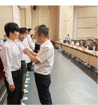 领导为2024级本研新生代表佩戴校徽。象征着新生正式成为一名真正的工大人,“格物明理,致知笃行”的校训精神,也将在同学们身上得到传承。
